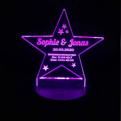 So erhalten Sie Ihre Urkunde und einen dekorativen Sternaufsteller mit Ihrem Sternnamen aus Plexiglas, wahlweise beleuchtet oder unbeleuchtet, einen Sternaufsteller aus Metall und Holz und einen großen Holzstern aus hochwertigem Mangoholz, in den Ihre persönlichen Sterndaten für Sie eingraviert werden.