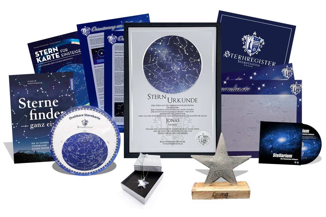 Zu der Grundausstattung jedes Sterntaufe-Pakets gehören die Sternurkunde, zwei Sternkarten zum Auffinden Ihres Sterns am Himmel und eine ausführliche Anleitung mit mehreren Möglichkeiten Ihren Stern zu finden. Neben dieser Grundausstattung können Sie noch diverses sinnvolles Zubehör zu Ihrer Sternentaufe bei uns erwerben. Dazu gehören z.B. eine Rahmung für die Urkunde, eine drehbare Sternkarte, verschiedene Stern-Trophäen und vieles weitere mehr. Teilweise ist in den Sternpaketen schon Zubehör enthalten – dies kann jedoch auch einzeln zu Ihrer Sterntaufe-Bestellung hinzu bestellt werden.
