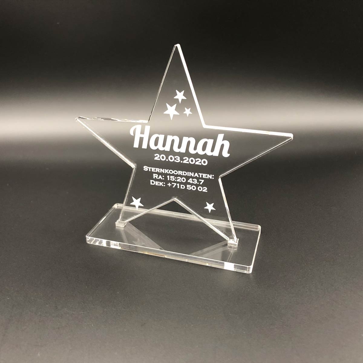 Der von Ihnen gewählte Sternname, das Taufdatum und die Koordinaten Ihres Sterns werden für sie auf den Stern graviert.